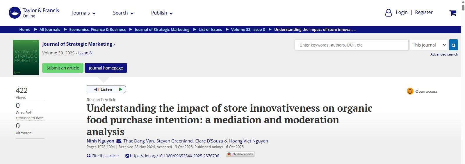 Tác động của tính đổi mới của cửa hàng đến ý định mua thực phẩm hữu cơ: Phân tích vai trò trung gian và điều tiết - Công bố quốc tế của CSTRAD trên tạp chí Journal of Strategic Marketing (ABDC: A, Scopus Q1, ESCI IF 3.1)